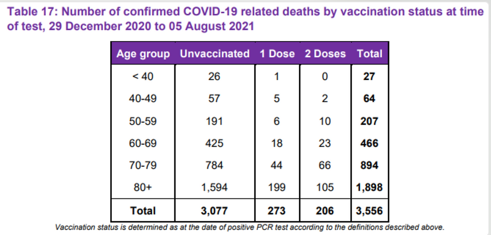It is widely accepted due to a study carried out early on in the alleged Covid-19 pandemic that the average time from infection with Covid-19 to death is around 18.5 days. Therefore, if we take the confirmed infections around 18 days prior to the week of 29th July to the 5th August we can work out the death rate in the population categorised by vaccination status.