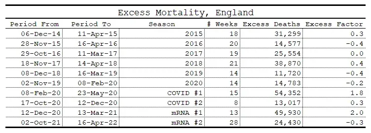 Looking at seasonal mortality, England usually experiences winter excess. COVID-19 arrived late in the 2020 season and caused 1.8 times as many deaths as expected. This is actually lower than the first period of excess death during the mRNA era, albeit this being during a period of typically higher excess.