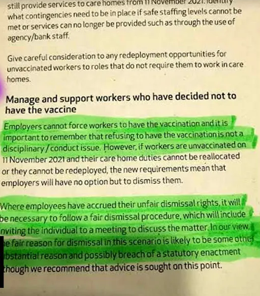 A leaked NHS document allegedly sent to care home management clearly states that care home staff will be dismissed from their employment if they have decided not to have the Covid-19 injection, but that it must be done under another “substantial reason” in order to avoid claims of unfair dismissal.