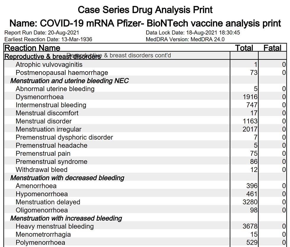 The MHRA have also stated they are now investigating it, and this is because they have received 1,163 reports of menstrual disorders, 2,017 reports of menstruation irregularities, 1,916 reports of dysmenorrhoea (painful periods), 3,280 reports of delayed menstruation. All as adverse reactions to the Pfizer vaccine.